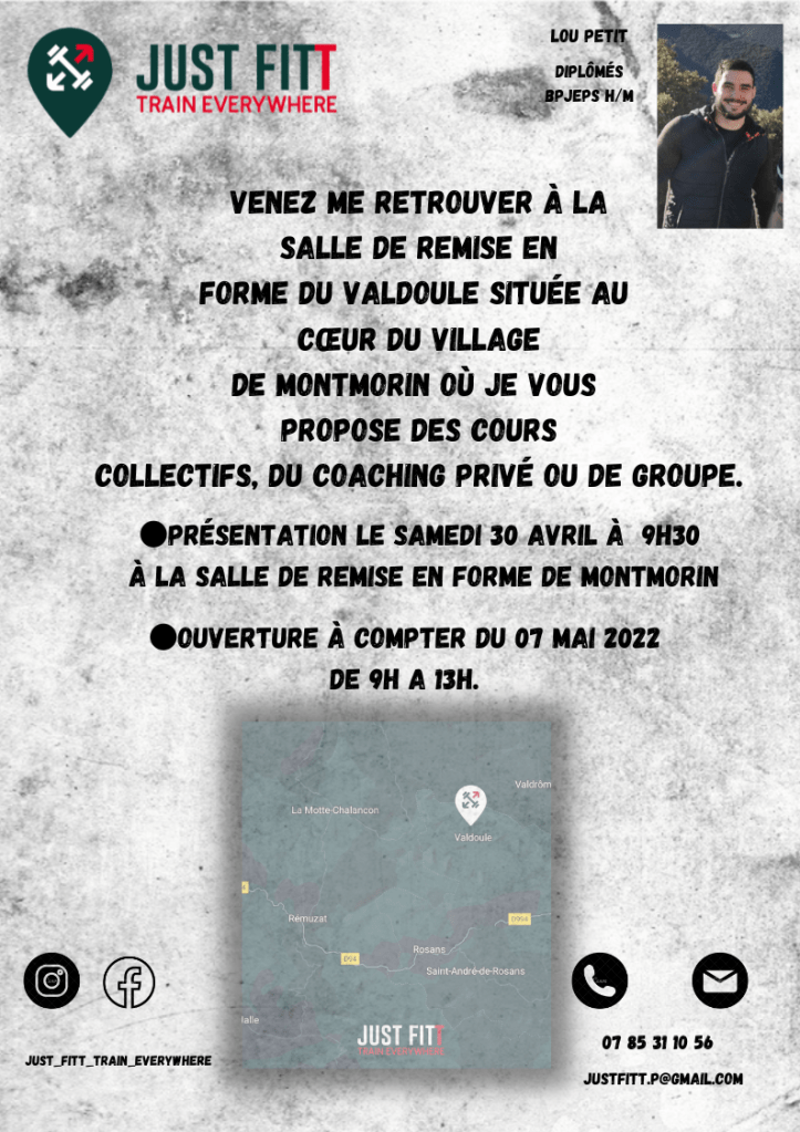 A l’occasion de la présentation du nouveau concept de la salle de remise en forme, le 30 avril 2022, la municipalité de Valdoule est heureuse de vous offrir café et viennoiseries à partir de 9 h.