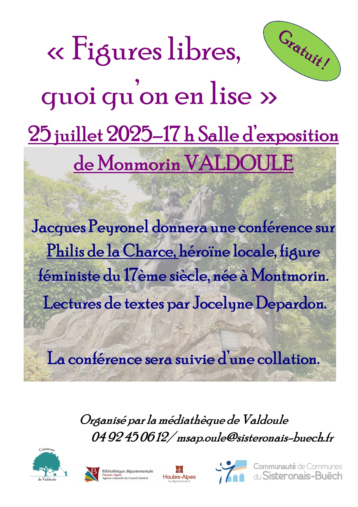 Vendredi 25 juillet : Conférence sur Philis de Charce par Jacques Peyronel avec lecture par Jocelyne Depardon. Honneur à cette héroïne locale et figure féministe du 17ème siècle, née à Montmorin.