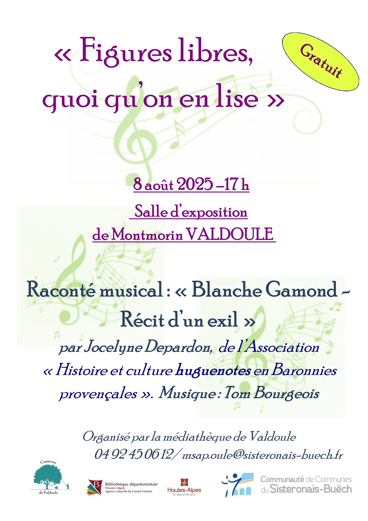 Vendredi 8 Août à 17h : Raconté musical « Blanche Gamond – récit d’un exil » par Jocelyne Depardon (de l’association Histoire et culture huguenotes en Baronnies provençales) accompagnée en musique par Tom Bourgeois.