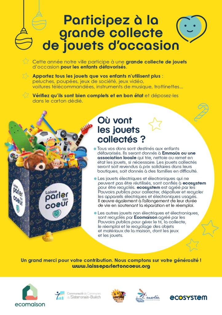 Info diverses : Une collecte de jouets sera à nouveau présente dans les locaux de l’Espace Rural Numérique du 15 au 30 novembre. Alors vérifiez vos placards…